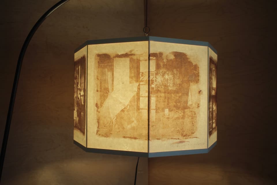 暗室作業によって月山和紙にプリントしたのは、これまで私が「ひじおりの灯」で作成した灯篭4基の記録写真です。1850年に開発され、日本では幕末から明治時代に主流だった鶏卵紙の写真印画法を月山和紙に施すことで、現代の写真がまるで遠い昔に撮影されたようにも見えます。和紙に染み込ませた卵白液の上に、感光剤である硝酸銀を刷毛で塗ることにより、個人の身体行為が機械によって生み出された写真のメディウムとして加わります。ここで硝酸銀溶液や卵白液を指して用いる写真の「メディウム」とは、「媒体」の他に「中間」や「霊媒」の意味を持つ語でもあります。