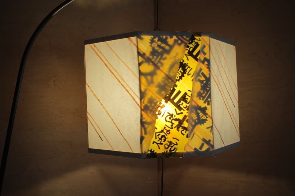 肘折ではいたるところで自然災害による破壊や風化の跡が見られ、仮設的に修復された風景がある。本灯籠はそのような状態をイメージして作られた。和紙に描かれた線は、銅山川沿いの傾斜に取り付けられた排水パイプが描く水の軌跡を表現している。湯花が絵具に使用され、重力を使って描かれた。和紙はある面が破られ不完全な状態になっており、そこを「立入禁止」のテープが塞いでいる。これは肘折ダムから地蔵倉へ向かう道にあるお地蔵さんに取り付けられていたテープと同じものである。立入禁止を知らせる役目は終わり、お地蔵さんの衣装のようになっている。この灯籠においても立入禁止の意味は持たないが、仮設的な装いとして機能している。