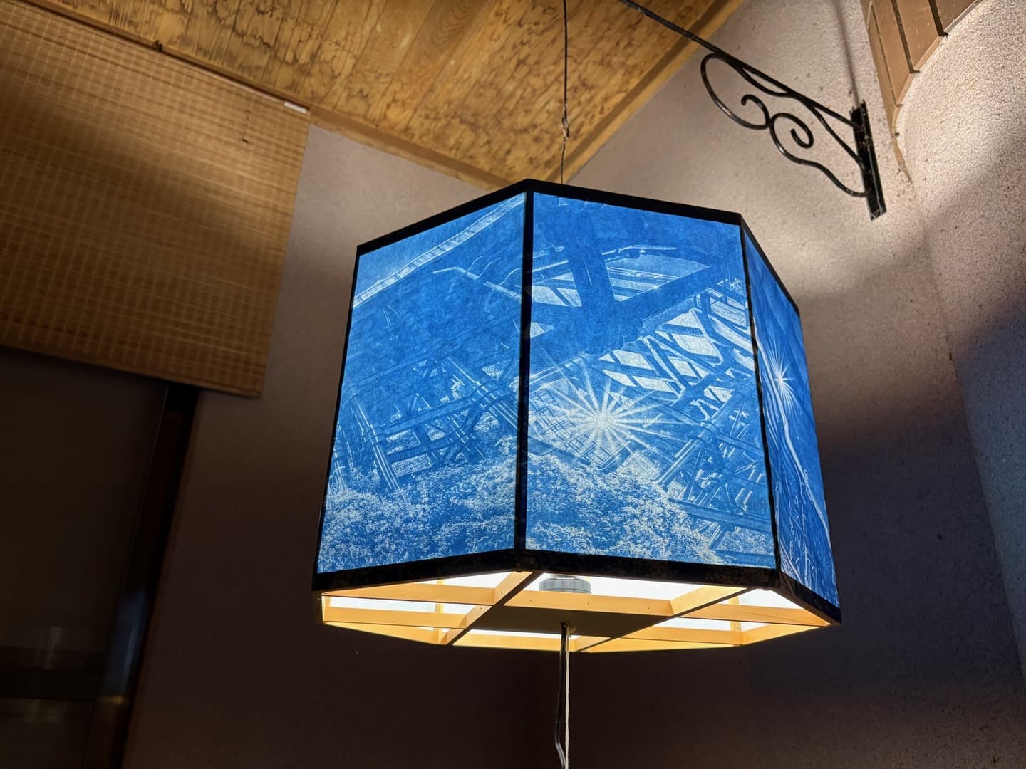 写真黎明期の印刷技法を介して、街灯と太陽、人工と自然の光によって現像された写真による灯籠は、昼と夜で全く異なる表情を見せます。「青写真(ブループリント)」とも呼ばれる特有の深い青色を基調に、橋を人と自然との「交わり」の象徴として結像することを試みました。